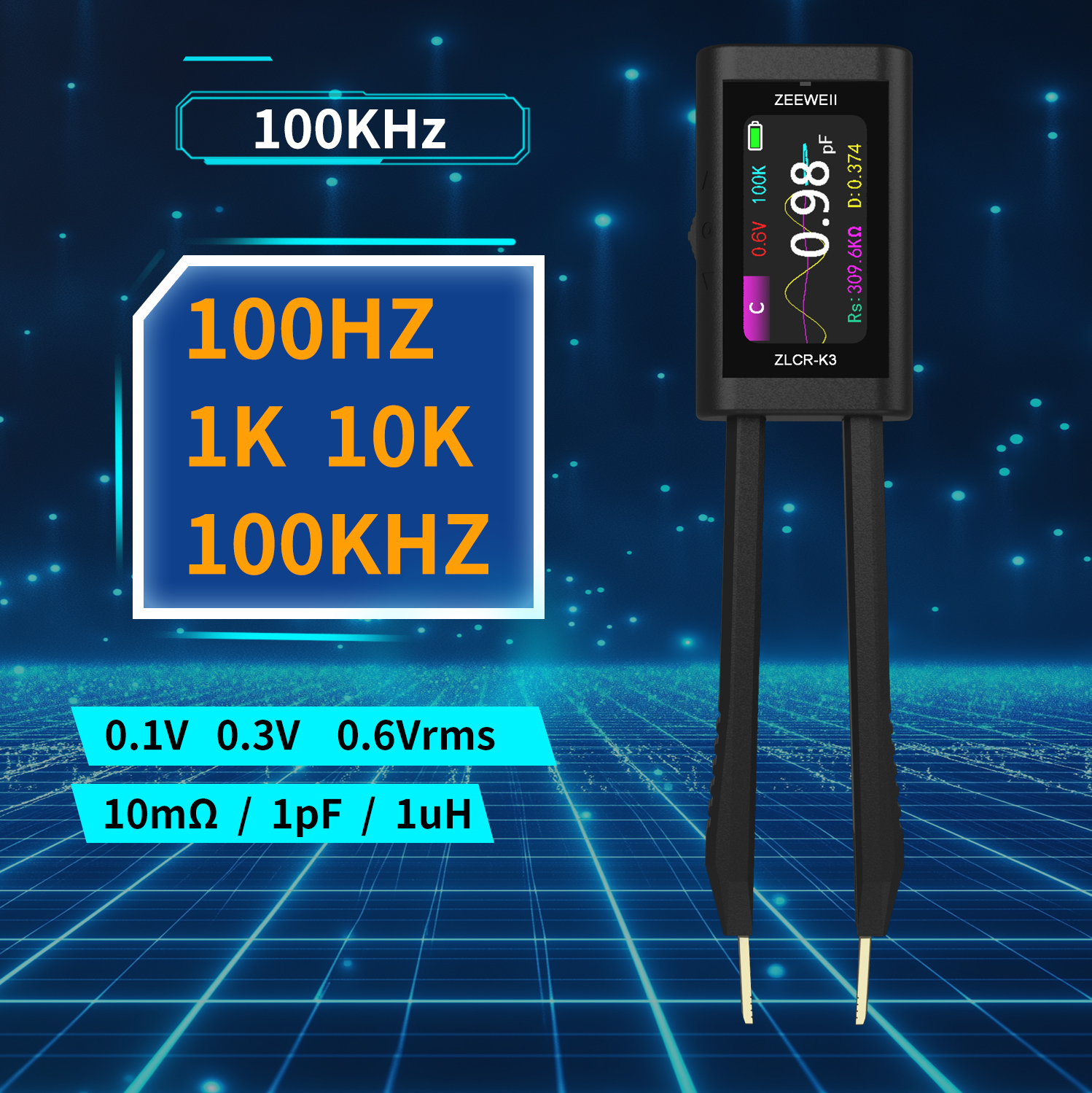 This ZLCR-K3 tweezer LCR meter has high measurement accuracy, can automatically identify the tested components, and supports 4 frequencies: 100 Hz, 1 kHz, 10 kHz, 100 kHz, and 3 voltages: 0.1V, 0.3V, 0.6V.